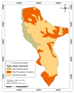 La commune rurale de Kirtachi couvre une superficie 38221 ha de formation forestière (brousse tigrée, savane, formation arbustive sur affleurement rocheux et cordon ripicole), soit 44% de l’occupation du sol. La commune est soumise à un climat de type sahélo-soudanien caractérisé par une longue saison sèche et une saison des pluies. La moyenne annuelle de la pluviométrie enregistrée de 1990 à 2023 s’élève à 569,26 ± 113,97 mm et une température moyenne annuelle 46,29°C. La couverture pédologique de la zone d’étude regroupe trois grands types de sols : (i) les sols peu évolués qui regroupent les sols peu évolués d’origine climatique et les sols peu évolués d’origine non climatique sur matériaux gravillonnaires ; (ii) les sols ferrugineux tropicaux qui sont essentiellement constitués de sols ferrugineux non ou peu lessivés sur sables, les sols ferrugineux lessivés à concrétions, les sols ferrugineux non ou peu lessivés associés à des sols ferrugineux ; (iii) Les sols hydromorphes de bas-fonds, mares, et cuvettes relativement plus riches en matières fertilisantes et plus aptes à des actions d’intensification (FAO, 2002) (Figure 2).