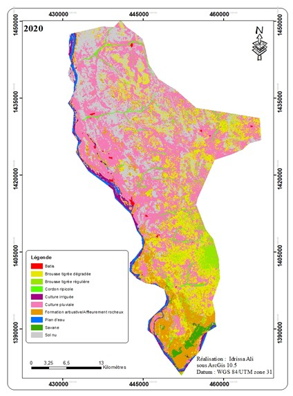 Cartes utilisées : La carte pédologique de reconnaissance de Gavaud et al., 1967, à l’échelle 1/5 00 000 produite par le service cartographique de l’ORSTOM, digitalisée sous Arc Gis 10.5. Les plages cartographiques des sols représentent des grands types de sols de la zone d’étude (sols peu évolués, sols ferrugineux tropicaux et sols hydromorphes). Puis, la carte de l’occupation du sol réalisée à l’aide d’image sentinelle de 2020 (résolution au sol de 10 mètres), intégrée dans un SIG et simplifiée (Ali et al, 2023). Dix (10) classes d’occupation du sol ont été identifiées à savoir : Brousse tigrée régulière, Brousse tigrée dégradée, Cordon ripicole, Cultures pluviales, Cultures irriguée, Sol nu, Savane, Formation arbustive sur affleurement, Plan d’eau et Bâtis.