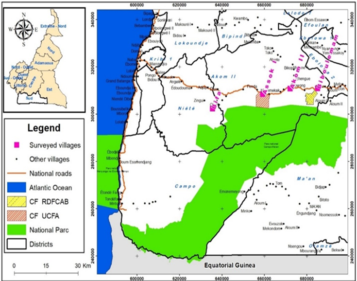 Study site: This study area located in the Akom 2 and Niete divisions. This area is part of the Atlantic coast of the Congo Basin. The climate is characteristic of a very classic Equato-Guinean regime with four seasons, two of which are dry and two rainy (Kabelong et al., 2018). The average temperature is 24.3°C, and annual rainfall is 2188 mm. The relief is relatively rugged, with altitudes ranging up to 72 m and 630 m, soils belong to the group of ferralitic soils (MINATD, 2015). Vegetation belongs to the Guineo-Congolese Evergreen Dense Humid Forest Domain, more precisely to the Atlantic Forest Sector, in the Biafran District (Letouzey, 1985). Local population is grouped into two large groups, Bulu and Bagyéli (MINATD, 2015). The surveys carried out in four villages belonging to the bulu ethnic group: Assok, Akom 2, Biboulemam, and Bifa. They were chosen for their proximity to the Campo-Ma’an National Park, or to some community forests (figure 1).