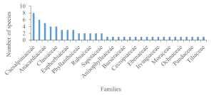 Systematic of the species: The survey of local residents identified 64 species divided into 60 genera and 32 families. The most represented families were Caesalpiniaceae (8 species), followed by Apocynaceae (6 species), Anacardiaceae (5 species), (figure 2).
