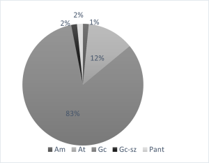 | Figure 3: Proportions (%) of phytogeographical types of the cited species. Am= Afro-Malagasy, At= Afrotropical, Gc= Guinean-Congolese, Gc-Sz= Guinean-Congolese and Sudanese-Zambezian, Pan= Pantropical |