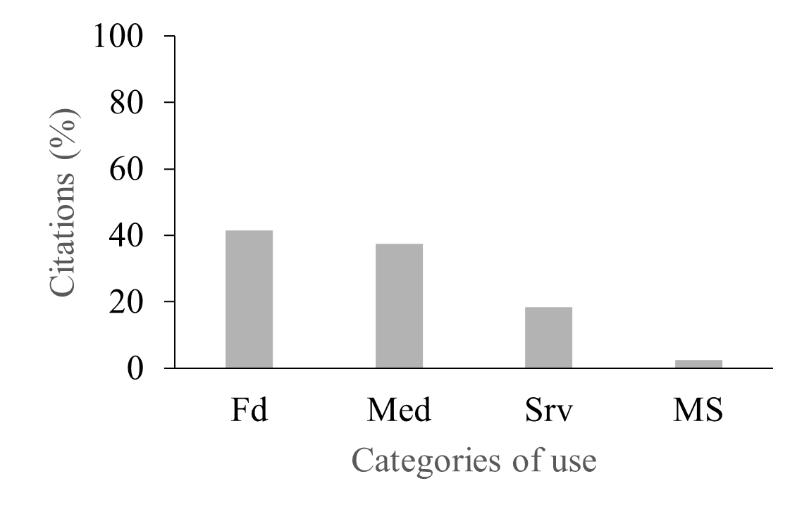Figure 5: Proportions of citations of the categories. Fd= Food; Med=Medicinal; Srv=Service; MS= Magico-Spiritual
